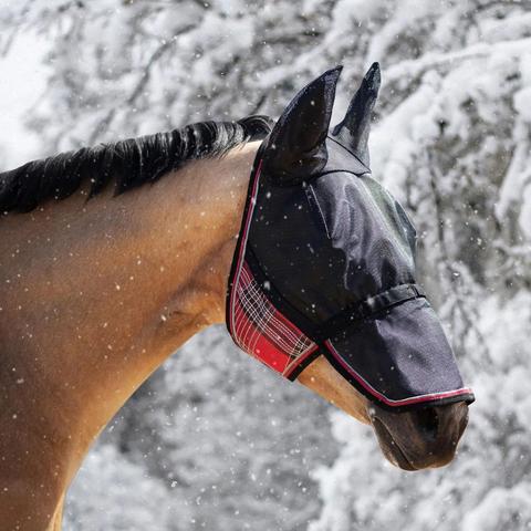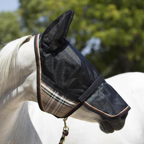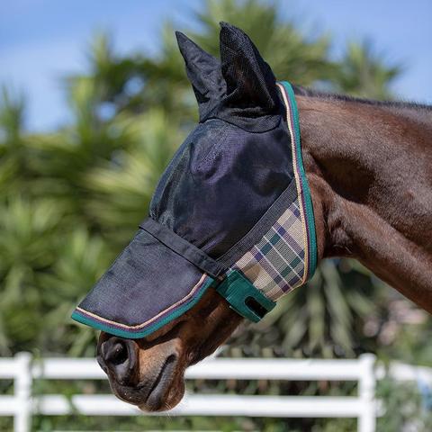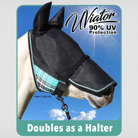 The Uviator Protective mask constructed with Kensington’s newest High UV Textilene(r), Solar Screen, that has a 90% UV rating, making it one of the most protective fly masks on the market. It features a double locking lead rope fastener which turns it into a CatchMask(R) with the clip of a lead rope. Interior is lined with soft fleece at sensitive spots to prevent rubbing. The design includes soft mesh ears, and long remoable nose piece.